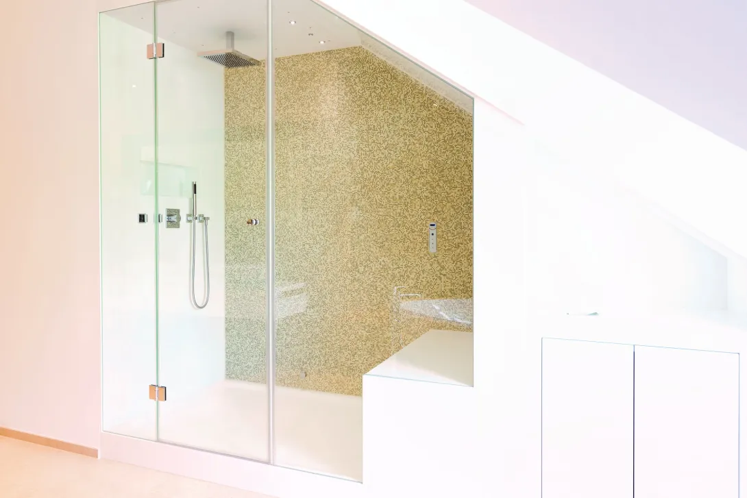 Mit frei planbaren Dampfbadlösungen können Duschen zu Dampfduschen ausgebaut werden. Die Dampftechnik findet dabei ihren Platz in der Sitzbank und ermöglicht so Wellnesskomfort zu Hause.