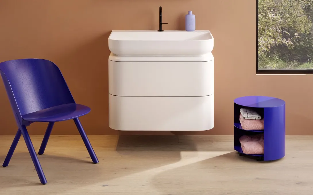 Das Badezimmer wird zum Wohnraum: Die Kollektion b:me von burgbad verbindet einen progressiven Look mit einer wohnlichen Ausstrahlung. Licht- und Schattenspiele von Sanddünen standen dabei Pate für die weiche Formsprache des gesamten Ensembles. Die Design-Serie b:me ist aufgrund der großen Farbpalette individualisierbar und eignet sich auch als Option für Kleinbäder.