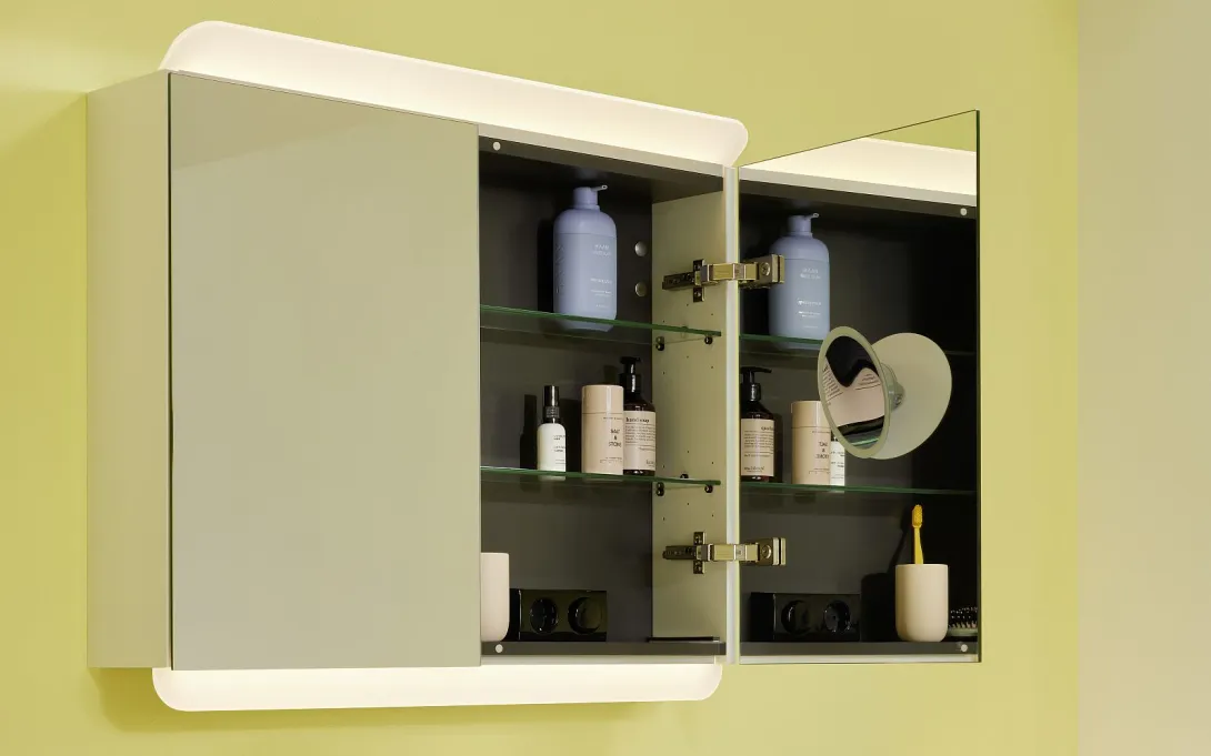 Die komfortabel ausgestatteten Spiegelschränke sind optional mit ein oder zwei LED-Aufsatzleuchten bestückt, was zusätzliche 5 cm Höhe bedeutet. Die wie schräg gestellten Lichtsegel runden den Spiegel nach oben und unten weich ab und sorgen für eine optimale Ausleuchtung des Gesichts.