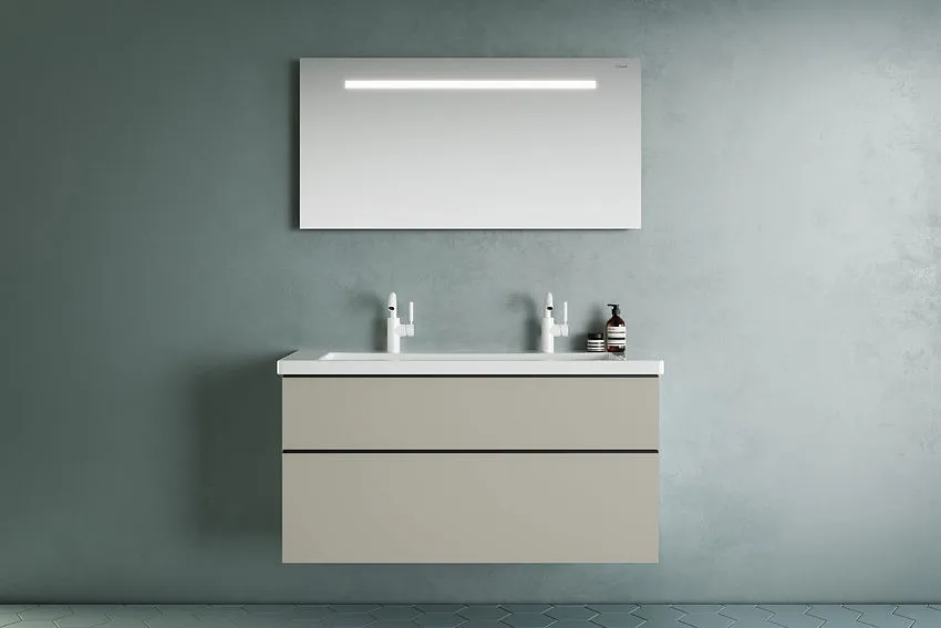 Neu ist der RL20-Spiegelschrank (sieben Varianten, 60 bis 160 cm Breite) mit umlaufender LED-Beleuchtung, stufenlos regelbarer Lichtfarbe, Dimmfunktion und integrierter E-Box mit USB-C, wahlweise als Aufputz- oder Wandeinbau-Variante, ausgezeichnet mit dem RAL-Gütezeichen Möbel Zirkulär Nachhaltig. Zusätzlich stehen runde Spiegel mit LED-Beleuchtung und optionaler Spiegelheizung zur Auswahl.