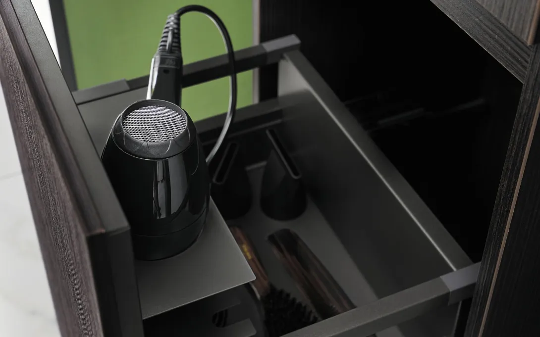 Die Hochschränke von Lin20 besitzen ausschließlich Türen und stehen somit im Kontrast zu den türenlosen Unterschränken. Die bodenstehende (2000 mm Höhe) Version ist etwas höher als die wandhängende (1700 mm Höhe) Variante – während die Breite (400 mm) bei beiden identisch ist. Zahlreiche Ausstattungs-Varianten versprechen höchsten Komfort. Während die einfache Ausführung mit einem festen Boden und drei Glaseinlegeböden begeistert, verfügen erweiterte Modelle über Winkelablagen an den Frontinnenseiten, einen integrierten Wäschekorb oder über beleuchtete Innenschubladen, Spiegel und Steckdosen. Neben der Standardtiefe (343 mm) werden zum Teil auch tiefenreduzierte Lösungen (nur 243 mm Tiefe) angeboten.