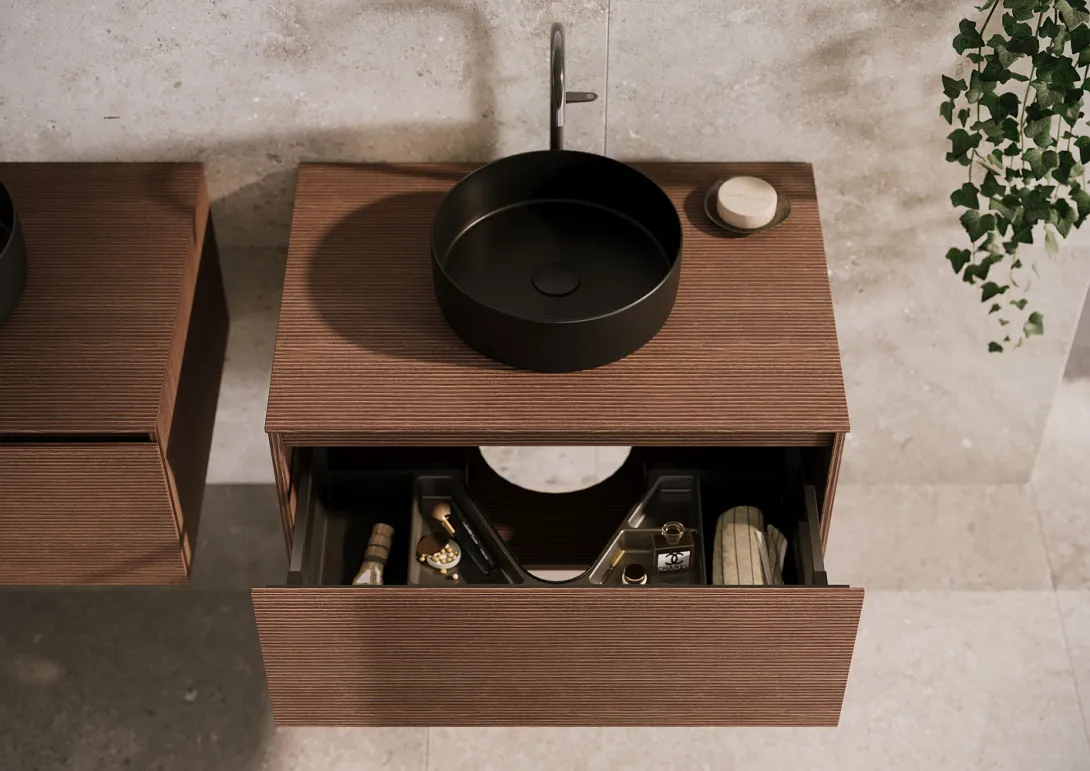 Alle Waschtische zeichnen sich durch eine minimalistische Gestaltung und attraktive Ablageflächen aus. Das gerundete Becken ist je nach Breite asymmetrisch oder zentriert eingelassen. Flächenwaschtische sind mit Doppelbecken oder mit einem großzügigen Einzelbecken verfügbar.