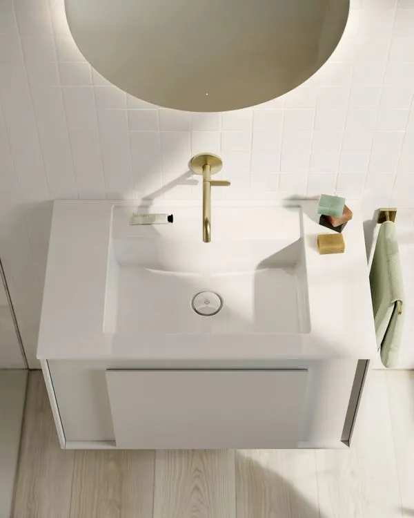 Der dezente Korpus bildet einen feinen Rahmen. Fronten und Becken wirken wie aus einem Guss. Das ergibt eine klare Optik, die lange modern bleibt. Der Rahmen kann in Weiß Matt sein oder in einer der zahlreichen Farben des Farbkonzepts.