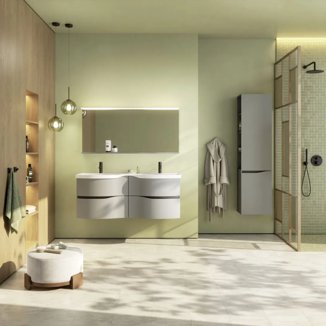 Organische Formensprache mit konkav und konvex wirkenden Linien und feiner Frontstärke. Das Ergebnis ist eine elegante, ruhige Badwirkung.