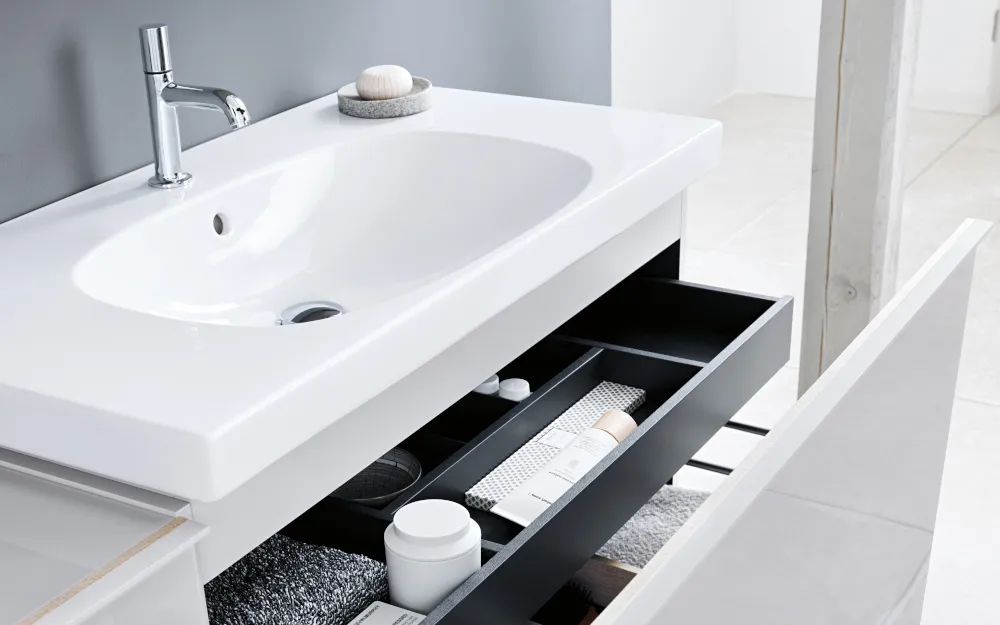 Die Serie Acanto von Geberit wurde von Designern auf Grundlage von Produkttests mit Konsumenten entwickelt, so dass ein breites Spektrum von Bedürfnissen des Alltags erfüllt werden kann. Vor allem das Innenleben der Möbel verdeutlicht dies: Flexible Ordnungsboxen für die Auszüge, Fächer und Ablagen in den Innentüren sorgen für Ordnung. Magnettafeln erlauben es, Ablagekörbe oder Regale genau dort anzubringen, wo Kosmetikartikel gerade gebraucht werden. Alle Anordnungen lassen sich leicht wieder rückgängig machen oder nach Laune verändern.