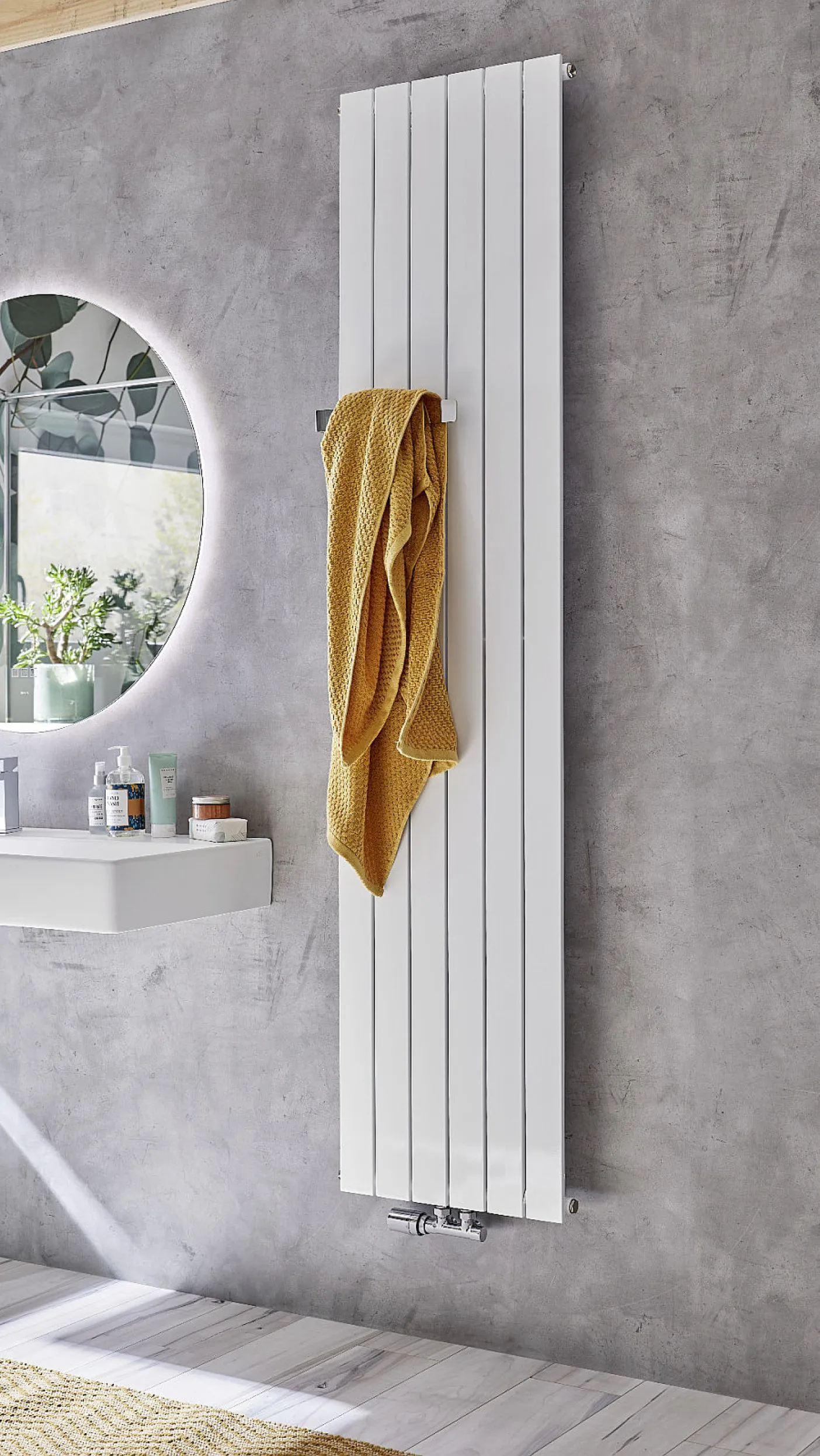 Ein besonderes Detail: Der Linie Plus verfügt über vereinzelt vorstehende Heizsprossen, auf die sich Handtücher zum Vorwärmen seitlich aufschieben lassen. Dadurch wird der Heizkörper nicht verdeckt und kann bei gleicher Heizleistung Badezimmer und Handtücher aufwärmen.