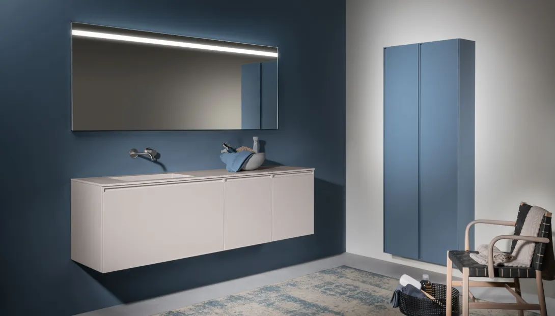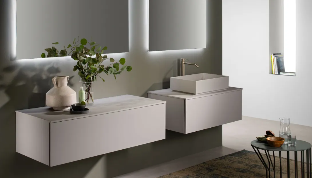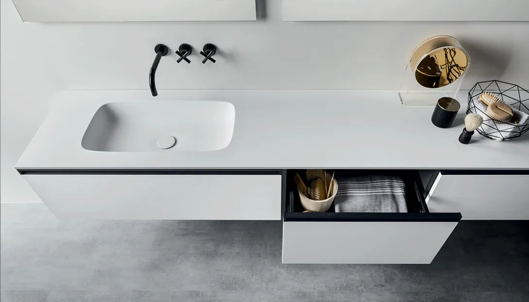 • Kombinierbar mit integrierten Becken, Aufsatzwaschbecken, offenen Elementen und Unterschränken