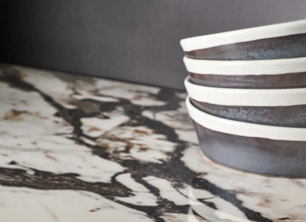 Die Optik des Steins zeichnet sich durch eine ursprüngliche Schönheit aus. Beim Stone Look von Grande trifft sie auf die Widerstandsfähigkeit des Feinsteinzeugs. Ob Ceppo di Gré, Gris du Gent, Granito Black oder Pietra di Vals wie hier im Bild: Mit Stone Look holen Sie sich harmonische Eleganz in Küche oder Wohnraum.