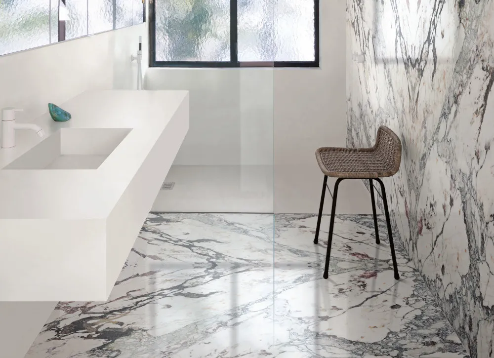Marazzi reproduziert die Vielfalt der Natur für seinen Marble Look: Vom Verde Aver-Marmor aus dem Aosta-Tal bis hin zum toskanischen Calacatta Vena Vecchia, vom Grigio Carnico bis hin zum exotischen Sahara Noir bereichern neue Inspirationen die Auswahl der bislang angebotenen klassischen Marmore der Kollektion Marble Look. Typisch Marazzi wurde auch an die Sicherheit gedacht: Die Marble-Fliesen sind mit einer Rutschhemmung versehen.